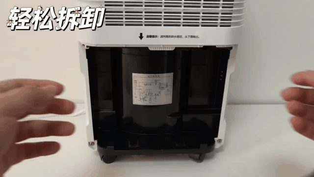 12L的水箱容量可以容纳一整天吸收的水,水满即停的设计也非常人性化,防止水满溢出,还要搞卫生的麻烦。机器背面做了排水口设计,力气小的群体倒水更方便。出风口设计在机器两侧,更好地促进空气流通。