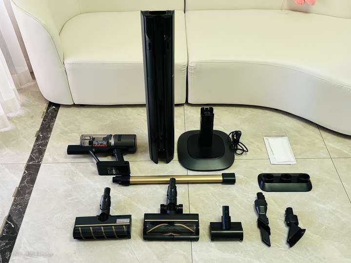 打开包装可以看到所有的配件:除开充电基站、底座和吸尘器主体外除螨刷、除尘软毛刷、二合一长扁吸、绿光软绒贴边地刷、地毯主刷各1个,金属延长杆1个,收纳支架1个,外加2个集尘袋,真的是一步到位了。