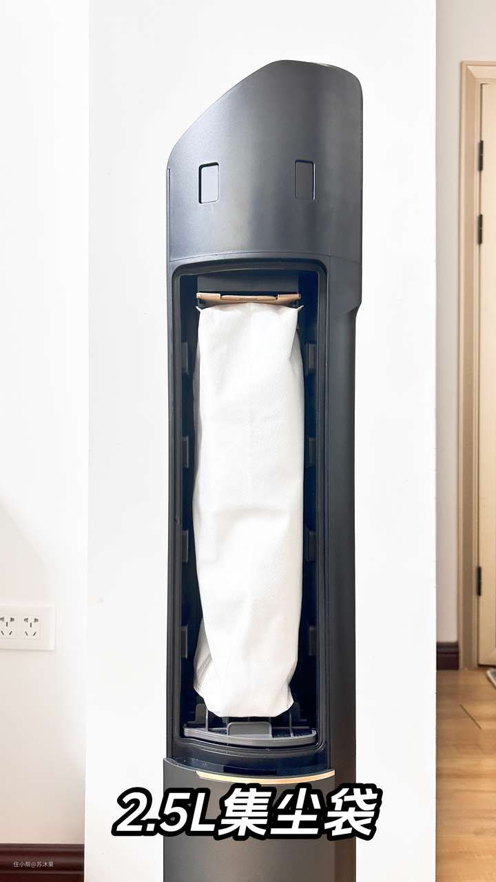 在基站的左侧面,是放置尘袋的地方,打开磁吸面盖就可以看看长长的尘袋了,超大的尘袋设计,容量是2.5L,是吸尘器尘杯的5倍以上,可以实现整整90天不用倒灰尘,这对于“懒人”或者忙于照顾孩子的宝妈宝爸来讲,简直太方便了!
