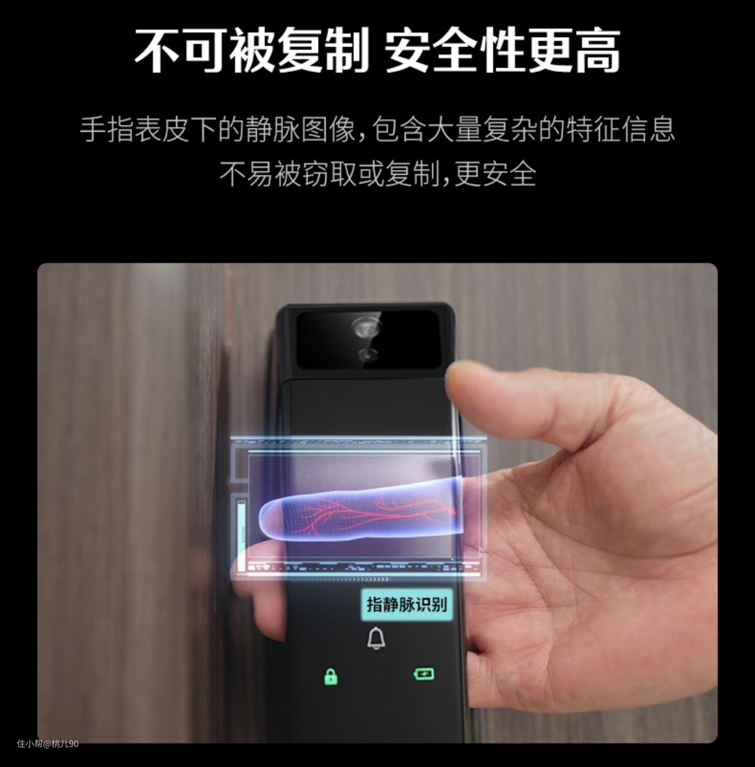 不同于前面两款产品,这款智能锁采用的是双核AI指静脉解锁。指静脉识别跟掌静脉识别类似,通过独一无二的静脉纹路进行识别解锁。相较于传统指纹识别,识别速度快,识别率高。不受指纹磨损、指纹不清晰等问题影响,相较于GPTfinger,对指纹状态非常非常不好的用户来讲会非常适合。