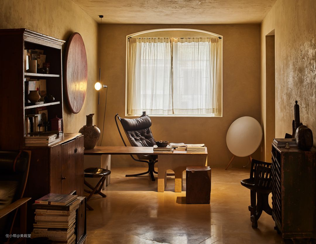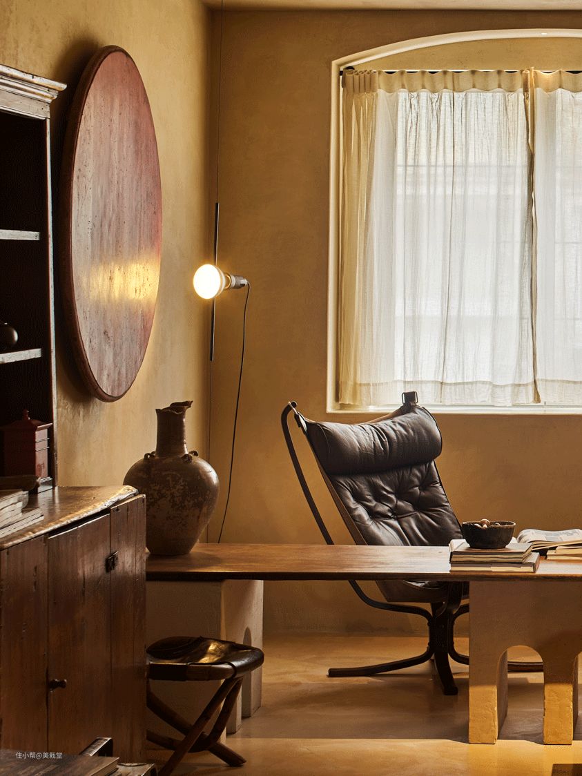 书房墙上的漆面圆桌被当作画幅呈现,红中透出黑色,与泥土黄的墙面相称,质感独特。书桌也是组合的,下面是圆拱形的一体七座的两个底座墩,上面是一张东南亚的柚木老板,高度是特意降低的,配合中古的狩猎椅,被当作休闲茶桌。