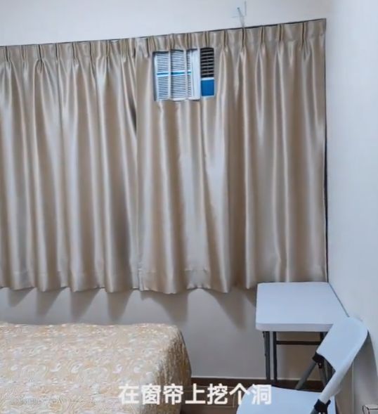 挂在窗上,想要晚上正常使用,又不想被人看光光,只能在窗帘上掏个洞。