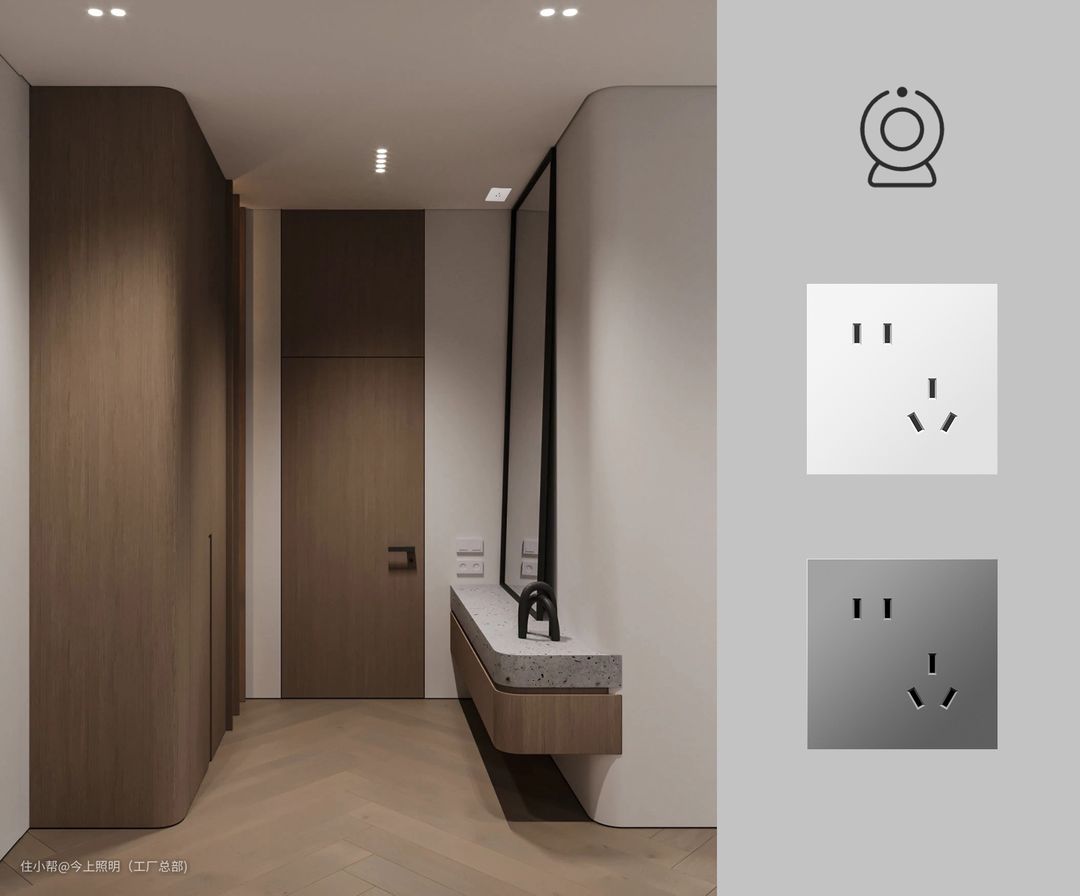 家里有老人或小孩的,入户门的摄像头非常有必要,通常会在入户门顶部两侧角落预留一个五孔插座,便于我们后期安装摄像头。