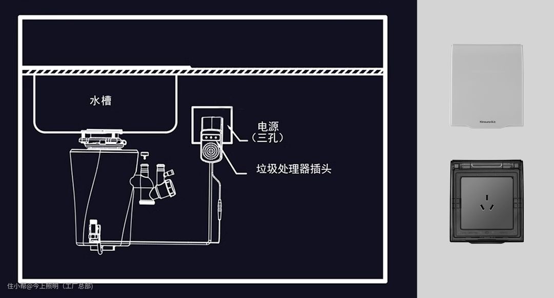 厨房最容易被漏掉的插座,就是水槽下下方的插座。水槽下方可以接入净水器、垃圾处理器、热水器等电器,为避免后期想加电器时没有插座,此处的插座一定要提前预留。值得注意的是,水槽下方离水源较近,建议装带防溅盒的插座。