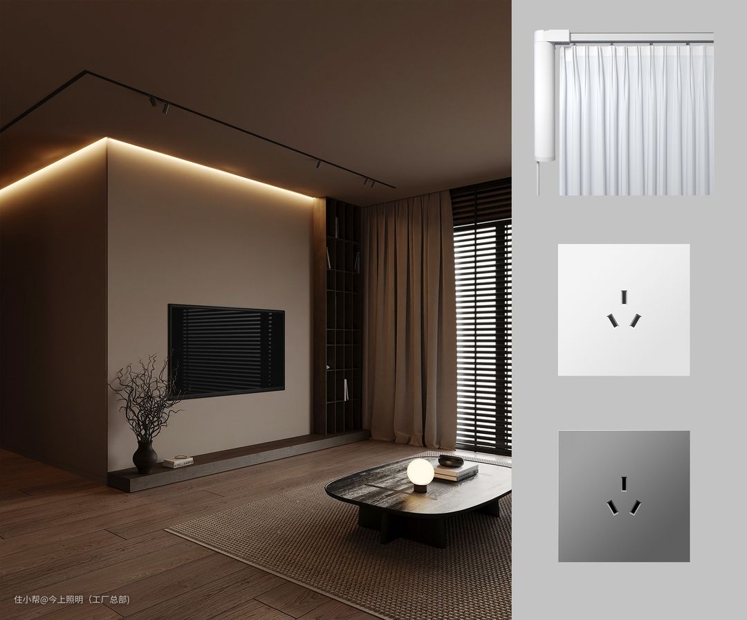 有电动窗帘需求的家庭,一定别忘了给窗帘电机预留插座,在窗帘盒一侧的墙面预留插座(建议离窗帘盒40-50cm左右),若不确定是哪一侧,可以在两侧都预留一个三孔插座。