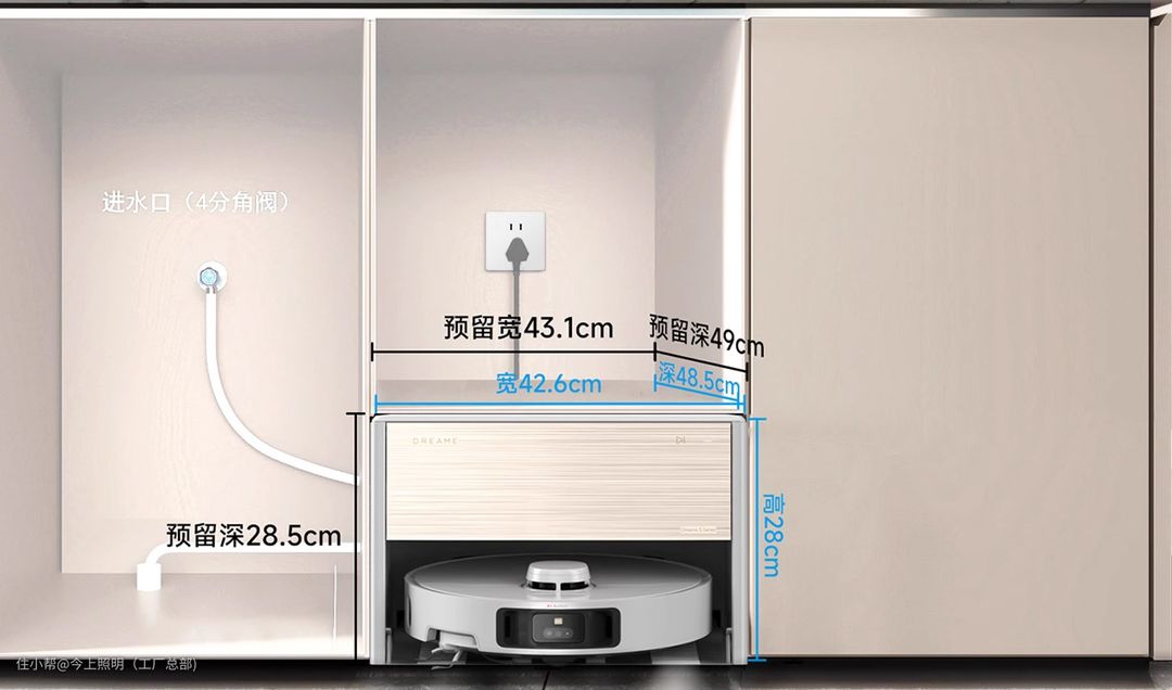 自动上下水的扫地机通常会放在洗漱台下方,可以在离地50cm处预留一个五孔插座,也可根据已确定的扫地机型号确定插座的位置,一般高于扫地机基站或在基站侧边位置。另外如果有小厨宝需求的,可以在洗漱台下方多增加一个插座。