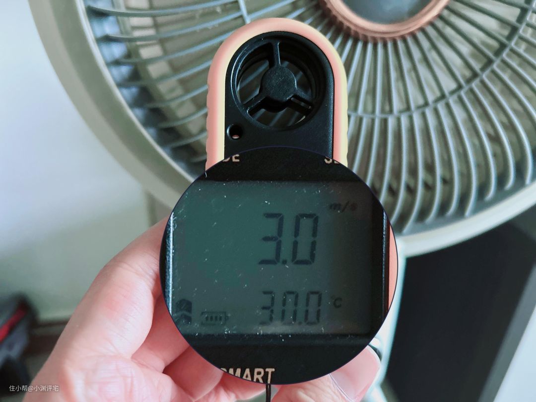 ②打开空气循环扇,马上又能发现另一个区别:风速。循环扇的风速明显更大,官方给的数据是6~8m/s。电风扇我测了一下,勉强能达到3m/s。