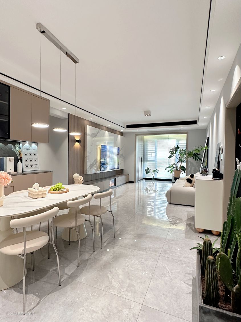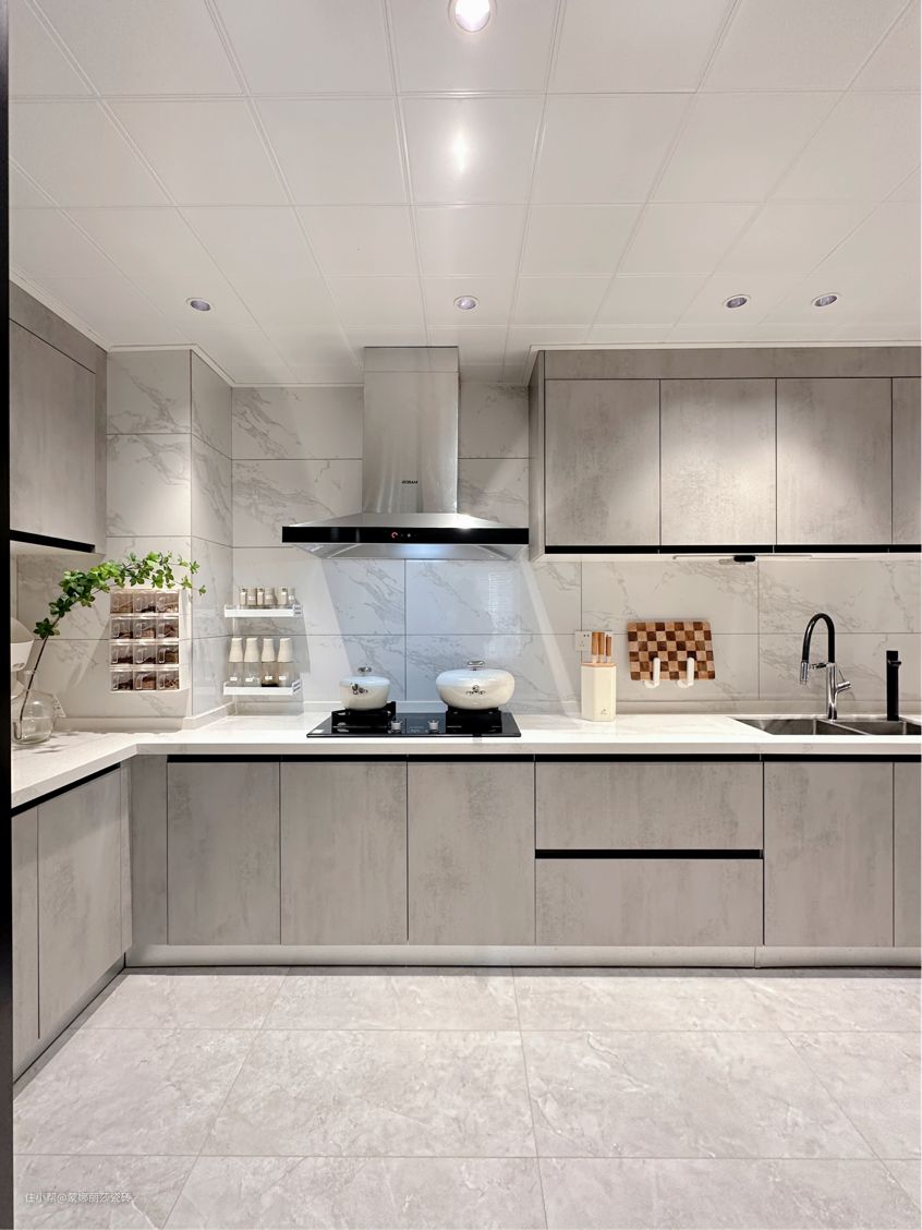 白色家具的纯净与灰色地砖相得益彰,使得整个空间显得宽敞而通透。无论是客餐厅还是厨房,这种搭配都能带来一种清新脱俗的感觉。