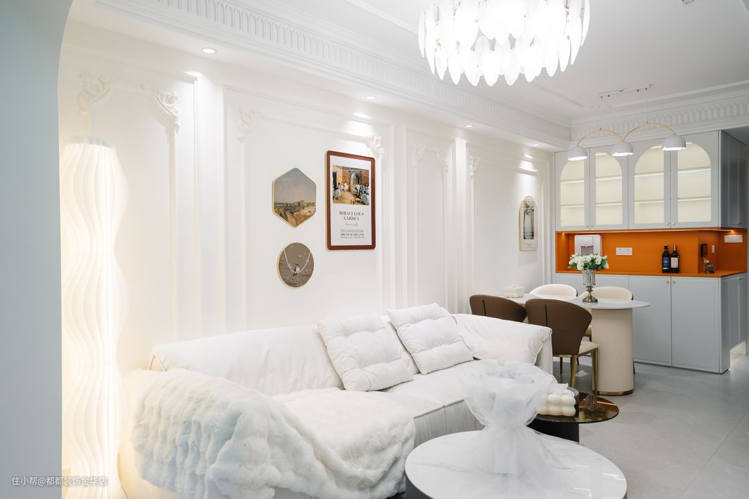 新法式整体以干净素雅的珍珠白或者低饱和度的浅色作为基调,添加柔和的对比色或者中间色。平衡了传统法式风配色的厚重感,与现代人们的生活态度相融合,营造出温馨舒适的氛围。
