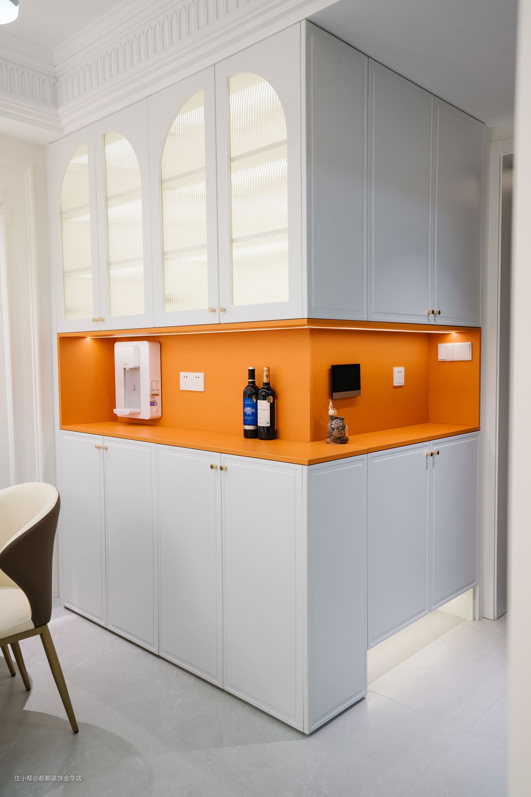 但鉴于如今许多户型的层高有限,设计师可以运用不同的设计方式和手法,例如拱形门洞,增加门窗在视觉高度上的比例,从而拉高门窗。弧形门洞在视觉上给人以舒适的感受,与法式的“浪漫”之感相得益彰。此外,拱形门洞还能够起到延伸整个空间的作用,显得通透又大气。