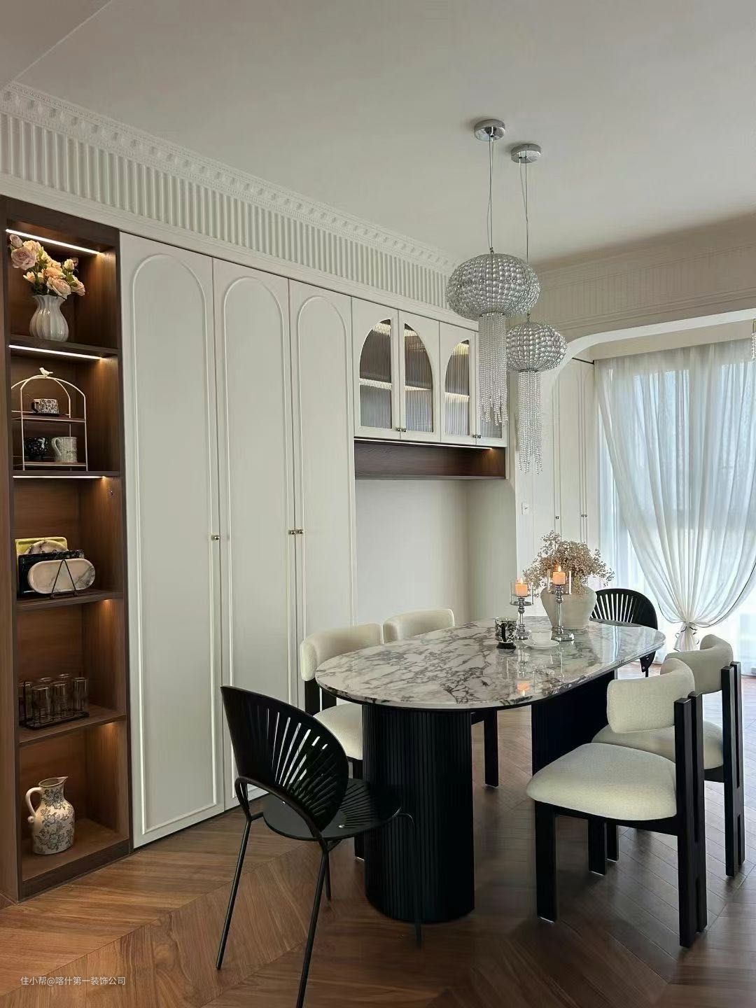 2. 浪漫感:设计中运用大量的曲线和花卉图案,营造出浪漫的氛围。同时,法式风格设计中常常运用通透的玻璃和镜子等元素,增加空间的延伸感与通透感。