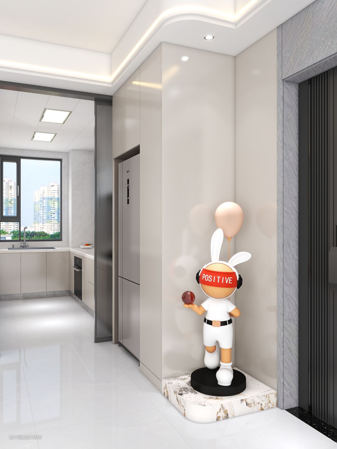 外侧的下方做了弧形的造型,采用石材饰面,上方放置一个精致的落地摆件,都为整体空间添加了一些精致感。
