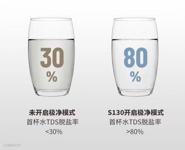 而352 S130净水器可通过开启极净模式,用纯净水冲洗RO膜的形式,使得RO膜无废水残留,同时大大降低膜表面结垢速度,首杯水TDS脱盐率可达80%以上,宝妈们早上起来的第一杯饮水的也是更安心。
