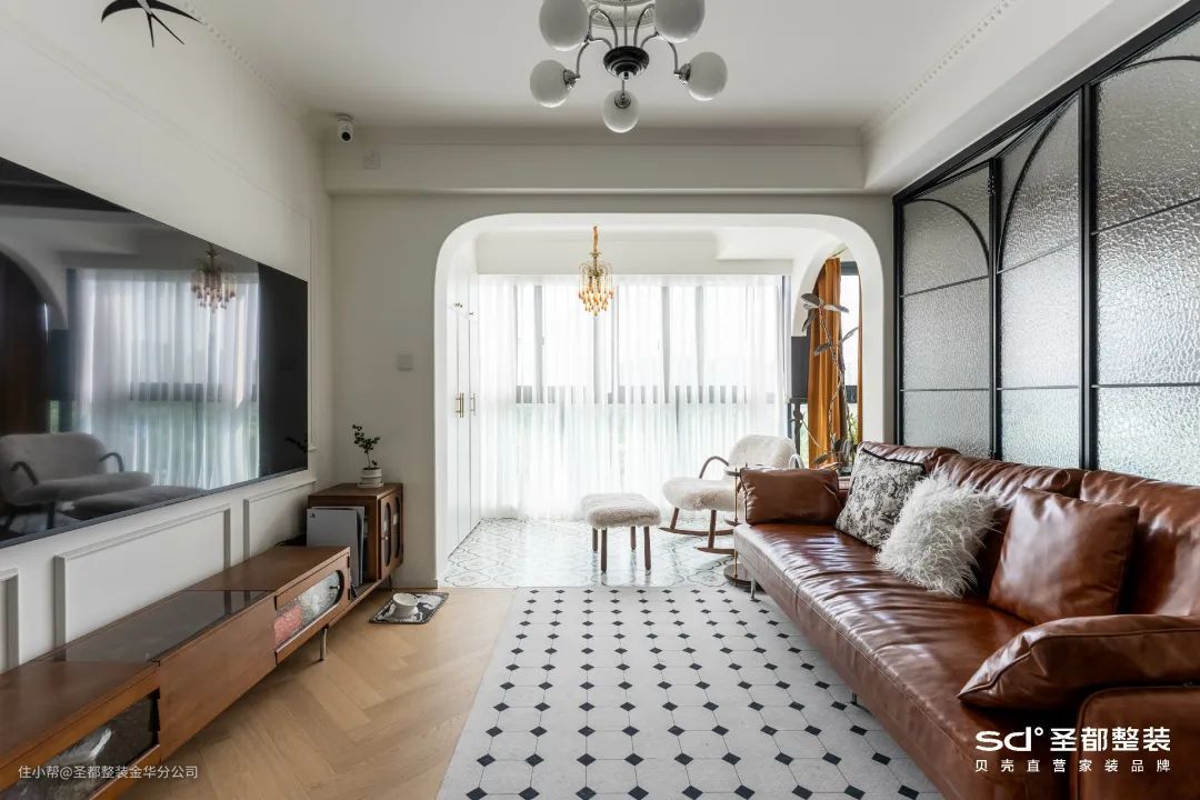 ✔ 比如《日不落》就将阳台一分为二,一部分纳入次卧规划成洗衣房;一部分纳入客厅规划成休闲区。两者以长虹玻璃门为隔断。