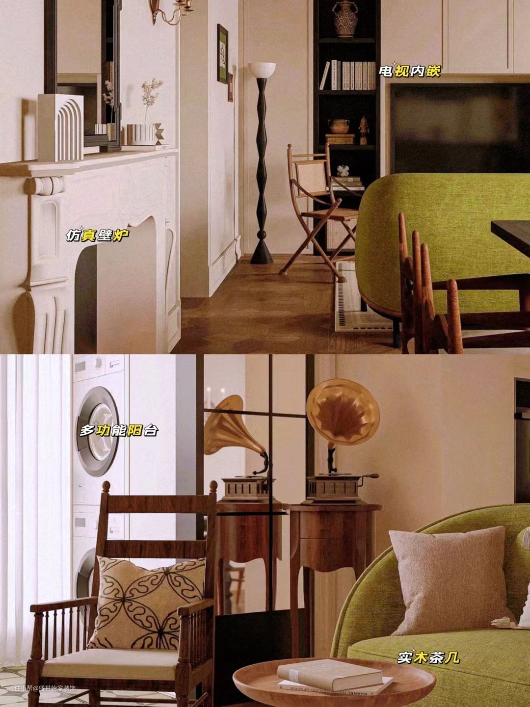 💫客厅:沙发与茶几的距离保持在80cm以上,确保行走自如。电视墙可适当留白,搭配复古风格的壁炉造型装饰,既实用又美观。