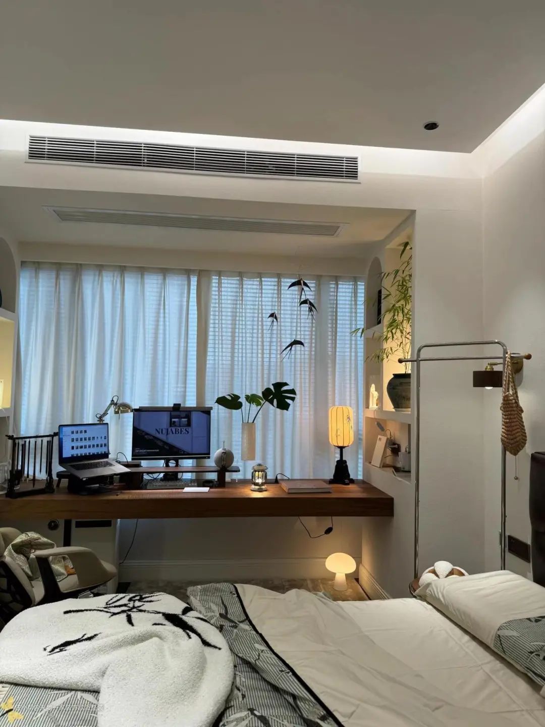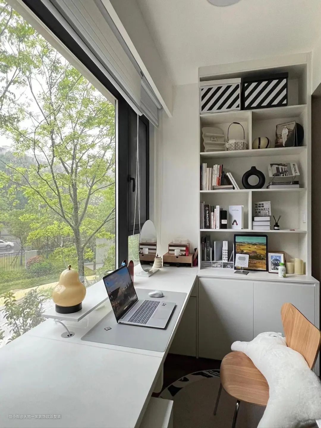 卧室是我们最私密、最放松的地方,将其中一处改成工作区是常见的方式之一。在选择家具时,可以考虑使用舒适的躺椅,以便在需要时随时休息,同时利用墙面空间安装书架或者储物柜,用来存放书籍和杂物,在布置上可以摆放一些绿植和装饰画,营造温馨安逸的氛围,还可以选购柔和的灯光和窗帘等软装,更好地放松身心。如果你的卧室设计有飘窗,那就以飘窗为基底,加上一张高低腿的书桌,白天还能解决光线问题,一举两得。