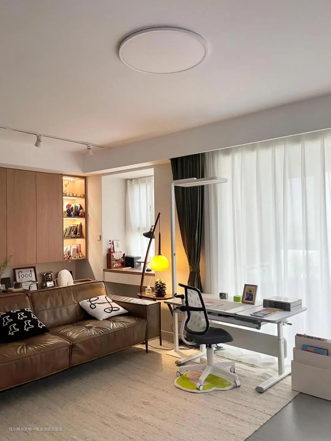 客厅是家里最为宽敞和明亮的区域之一了,好好利用和稍加布置,就能将其一角变身为舒适的办公区。选择一个靠窗的、光线充足的角落,定制或者购买一张带收纳功能的工作台和一把舒适的办公椅,再配上一个小书架,这样既不受客厅过往人的影响,而且累的时候伸个懒腰,拿起咖啡杯,眺望窗外的风景,舒缓视觉疲劳,身心也在这一刻得到治愈。