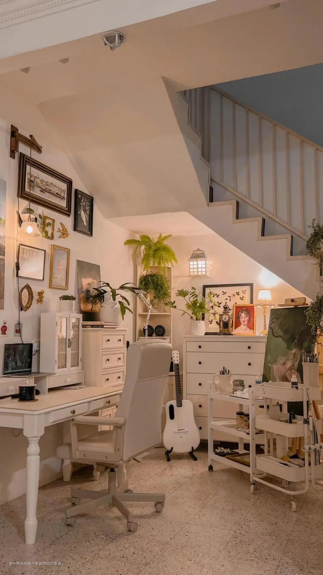如果你家是loft型,那么楼梯下的空间千万别浪费哦!这里既可以做储物空间,也可以打造成一个别具一格的工作地,唯一的缺点就是光线可能会不大友好,那么在上方安置一个吊灯或者安排一个落地灯就可以解决这项问题。选择一款合适楼梯下尺寸的办公桌椅,再搭配一些实用的小储物柜,就能让你在有限的空间发挥出无限的创意,同时这样也让家中空间更加整洁有序。