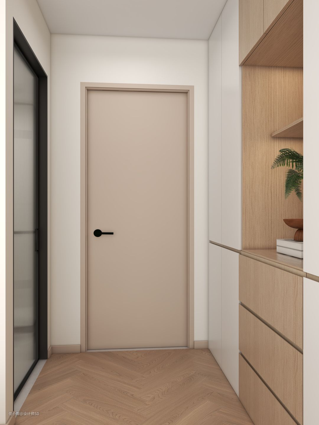 左边一组两门的高柜,采用无拉手的工艺,门板全部采用暖白色的平板门,不预留踢脚板与顶封板,看上去更加显得简洁一些。