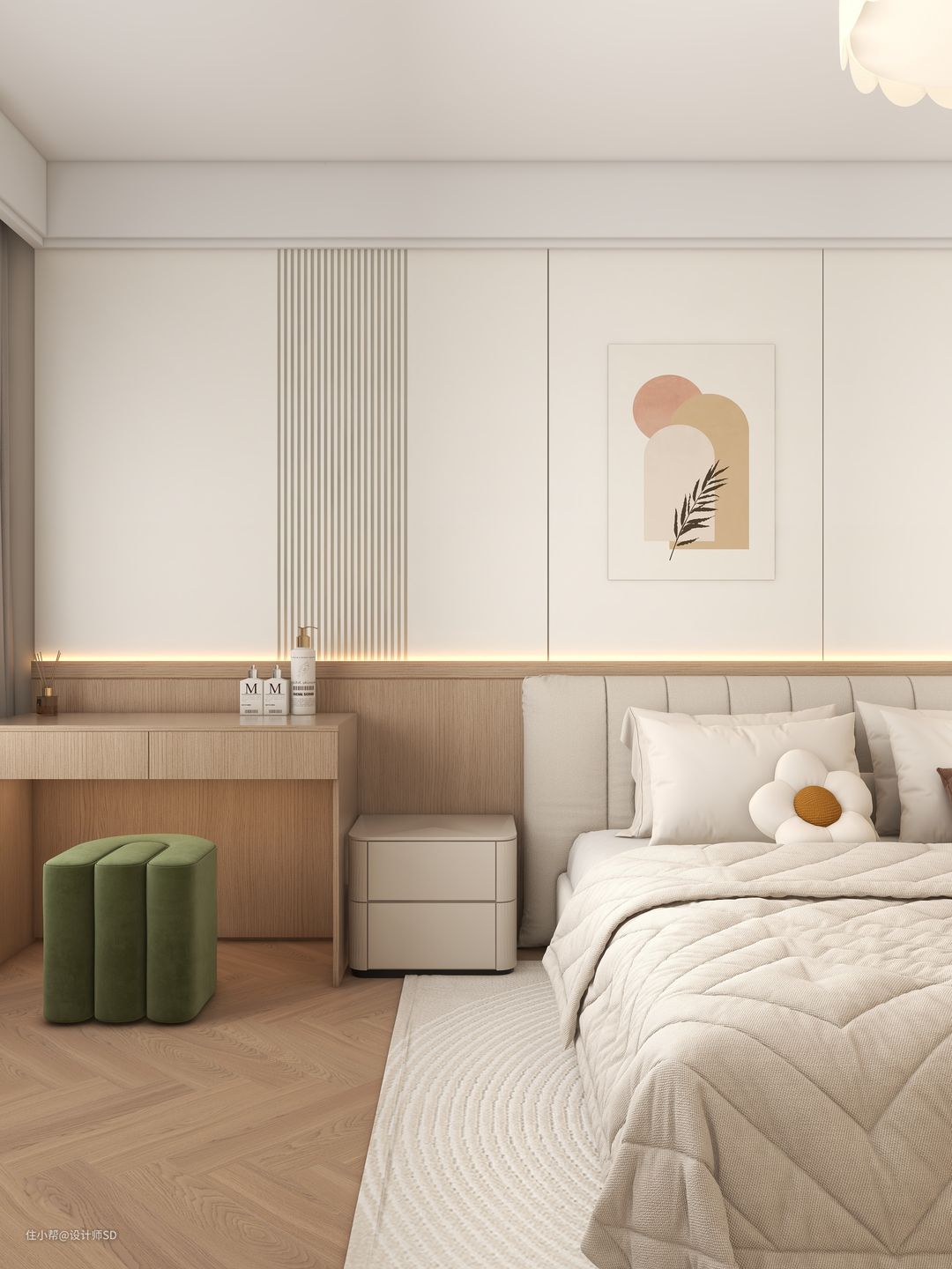 床头背景墙布置了分段式的造型,下方的墙裙安装了大面积原木色饰面板,在上端的位置还安装了一条暖色调的线型灯,见光不见灯的氛围真是太温馨了。