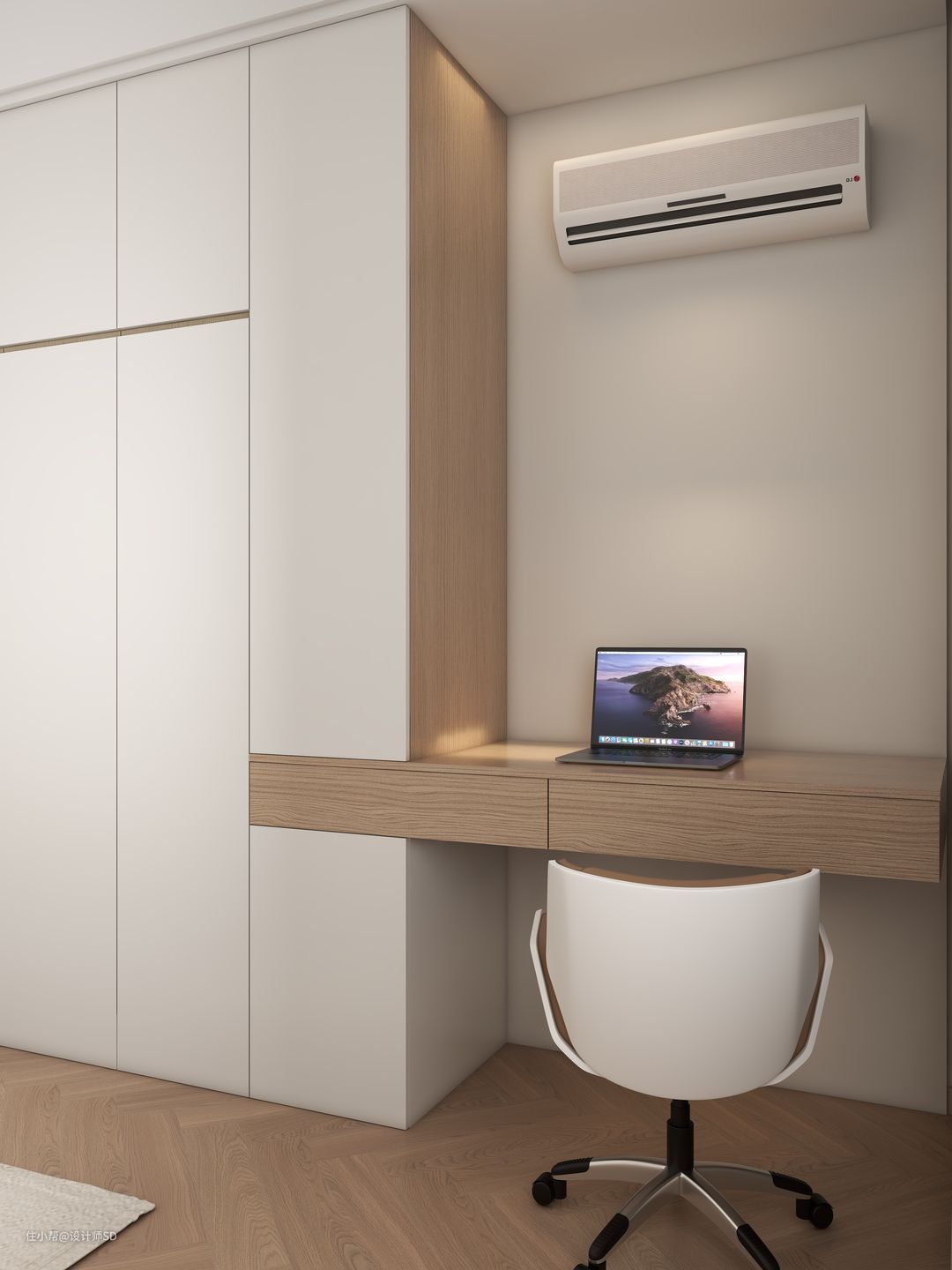 右侧的柜体则是大面积的挂衣区的位置了,还布置了一组写字桌的功能,一组抽屉穿插到衣柜内,原木色搭配暖白色门板,很是温馨舒适。而上方的墙面则是挂了一个空调机。