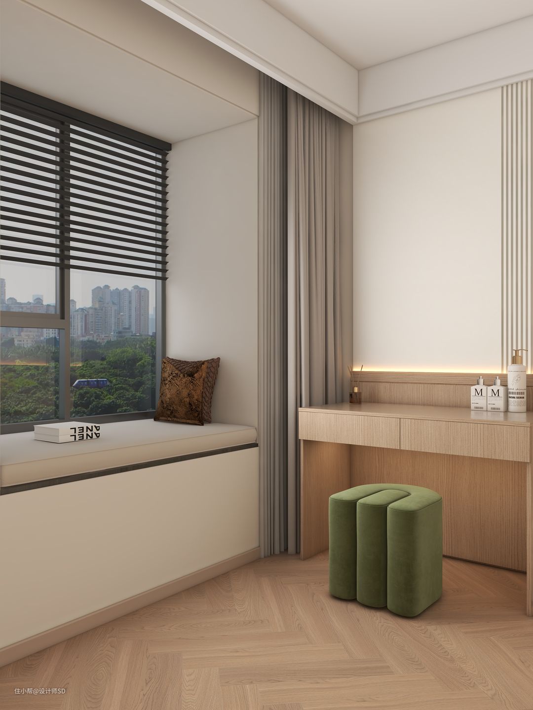 一组梳妆台桌面布置在飘窗的位置,平时梳妆的时候在这个位置的采光与通风很是舒适。整个桌面采用原色板材饰面,并且布置了两组抽屉。