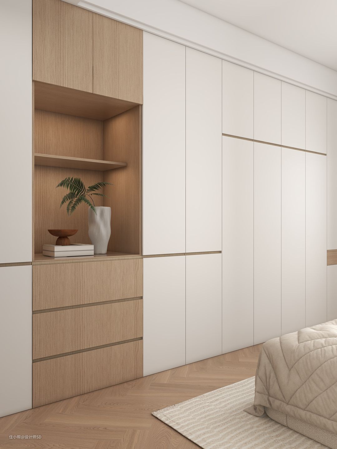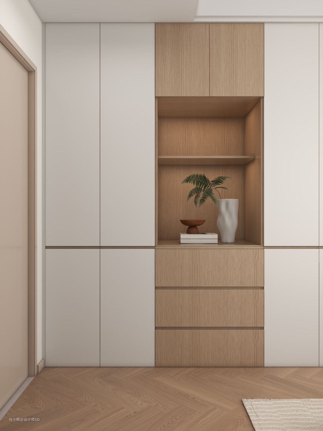 并排过来的柜体,布置了一组原木色来点缀,让整个柜体看上去更加有趣味性的同时,也起到了隔断的视觉感,不显压抑。