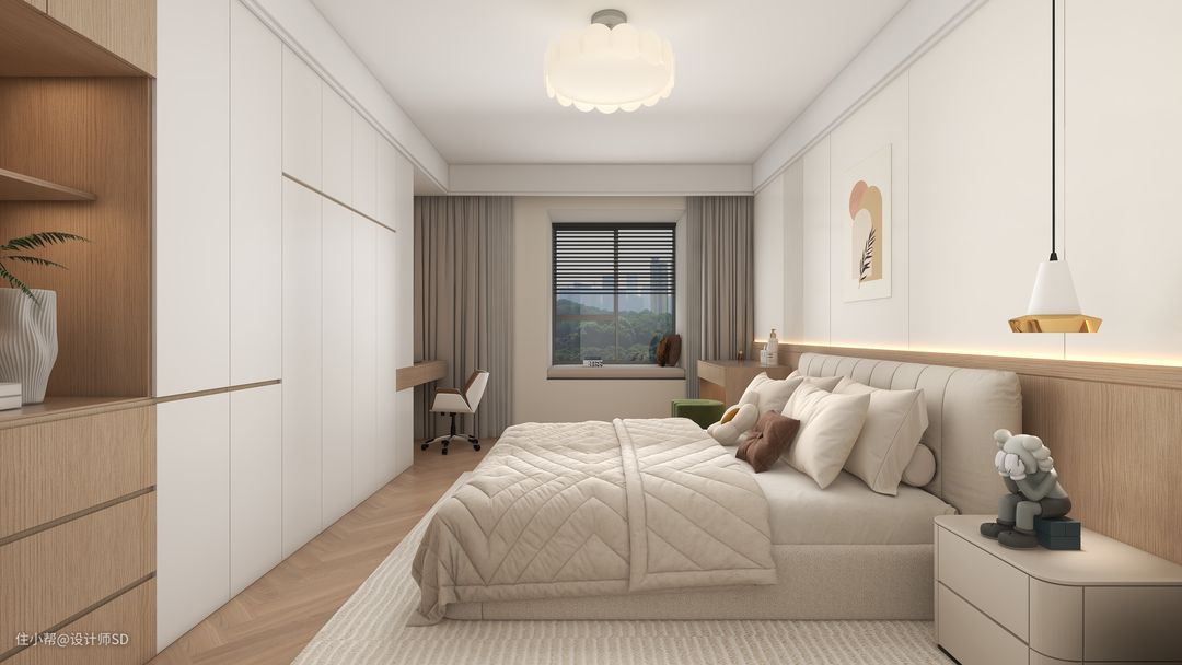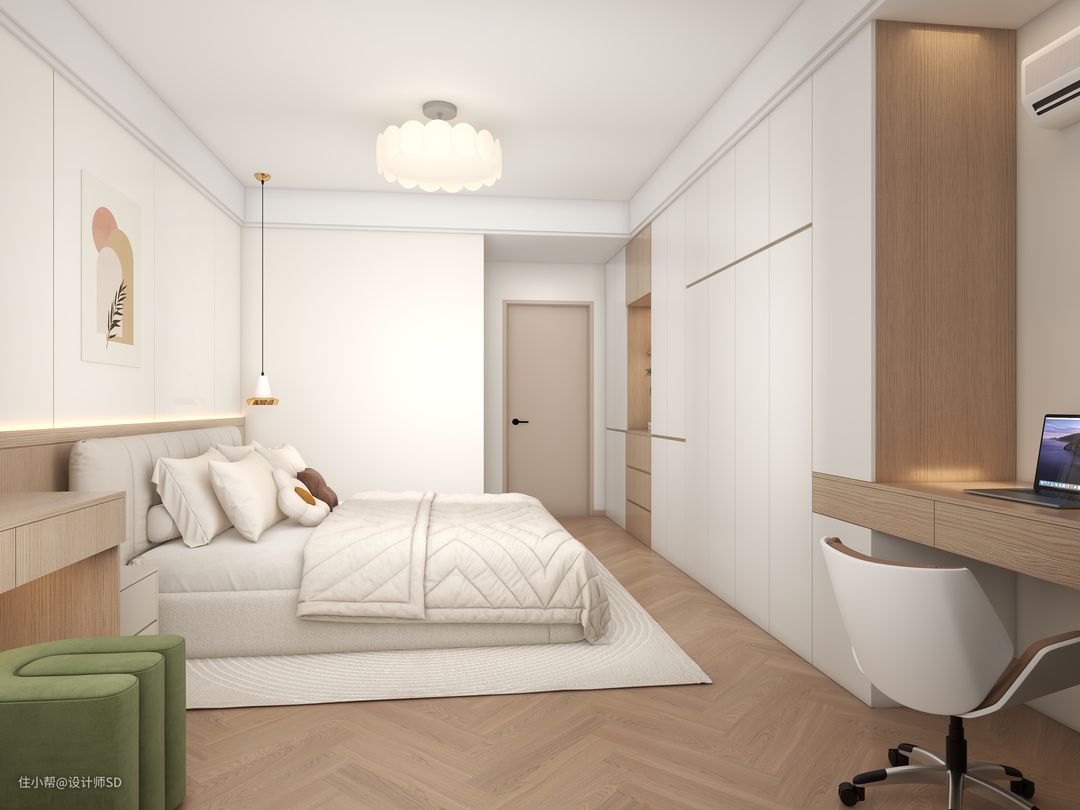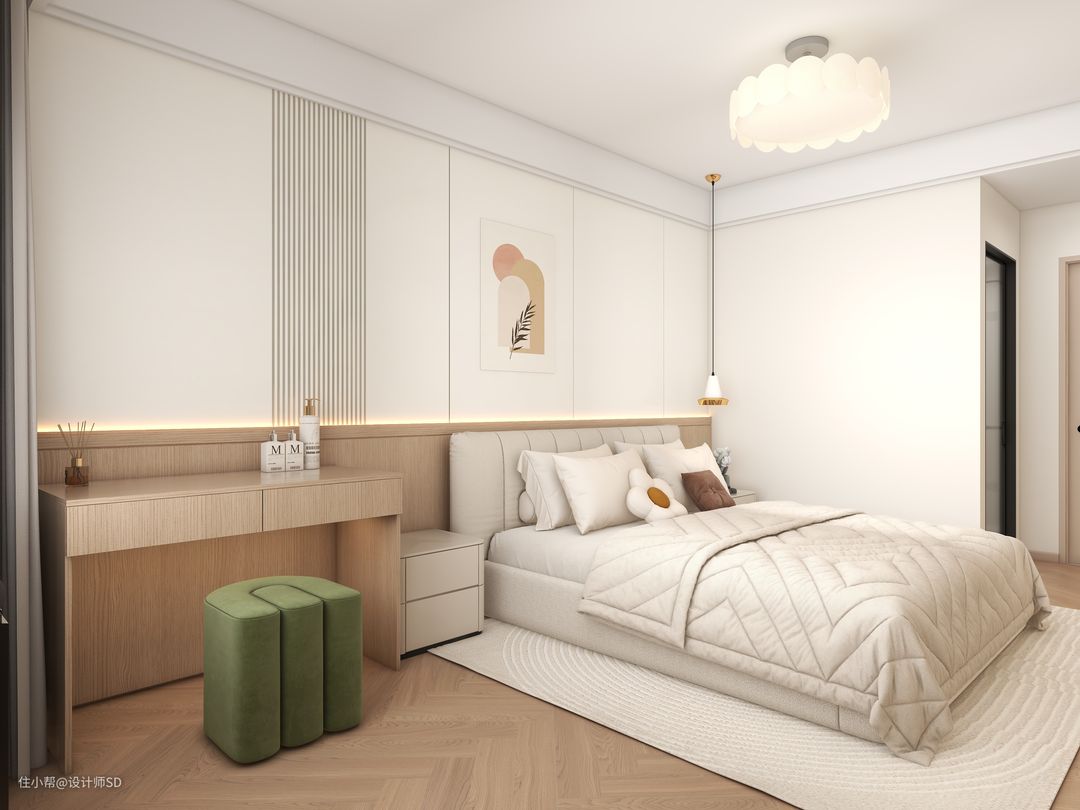 墙面做了整面墙的床头背景墙,还有一面5.7米的墙面布置了满墙的柜体,所剩的位置就满刷带暖色调的乳胶漆,简约又有温馨感。