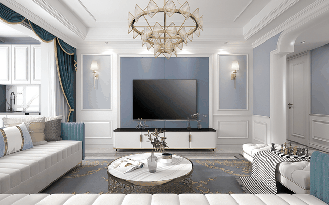 客厅的电视背景墙用了雾蓝色,深浅结合,更有层次感。电视柜用了高脚细腿款式,方便打扫卫生,而且金属柜子腿和拉手很有质感。