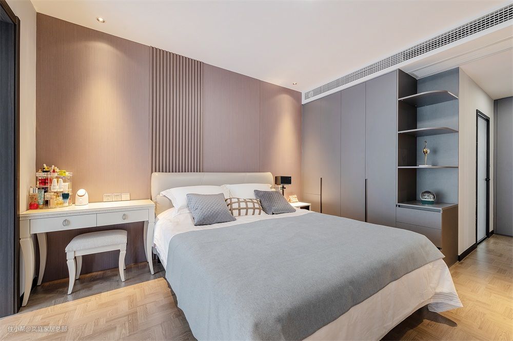 床侧的衣柜还衔接做了一体式的悬浮床头柜,还是定制的到顶衣柜,储物量超足,不落灰好打理,也解决了日常的使用需求。