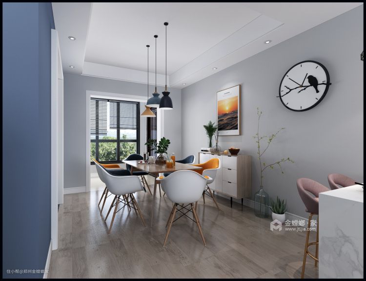 餐厅也是设计感满满,原木六人桌,墙壁上造型独特的装饰品,原木色的餐边柜,可以摆放小饰品。