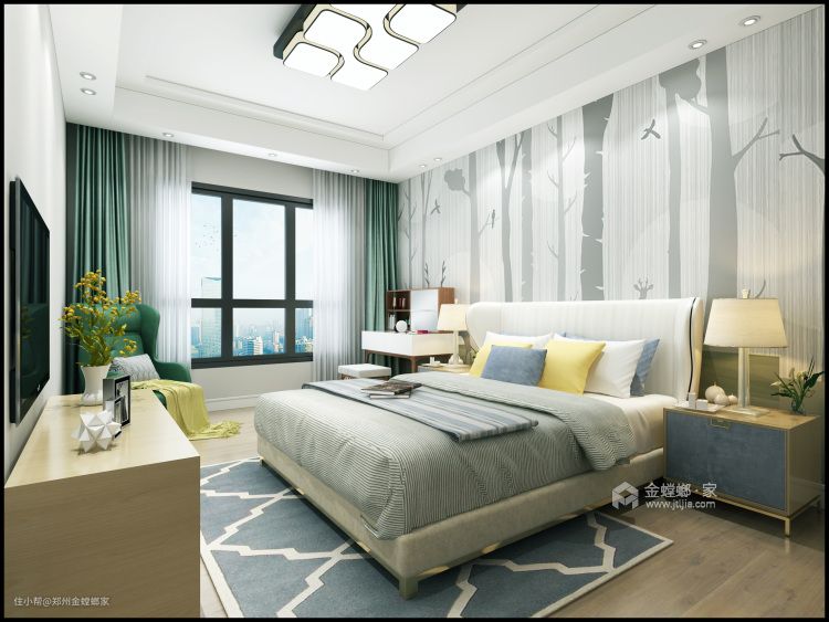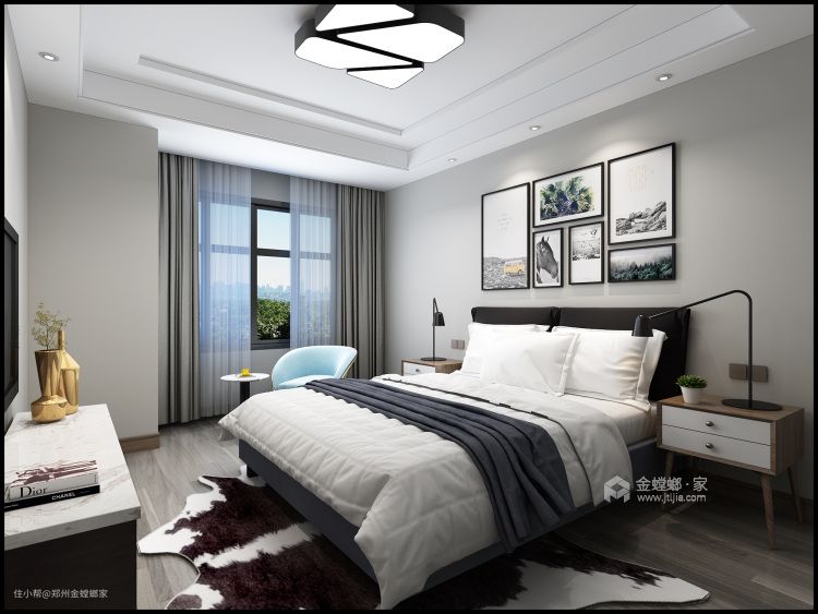 主卧黑白灰色调,原木色床头和电视柜点缀的装饰品,让整个空间不那么冰冷,床头背景绿色植物,呼应了北欧自然清新的设计理念。 次卧是儿童房,为将来小孩准备,中性的风格,无论男女孩都可以,蓝灰色的基调,搭配原木柜体,点缀柃檬黄,俏皮又可爱。床头背景是森林,贴合北欧风向往大自然的基调,个性独特,整个空间的点睛之笔