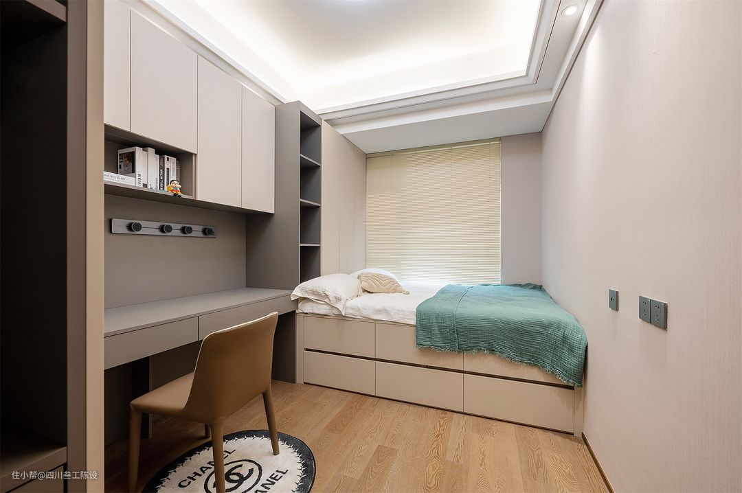 亲子房的面积通常不会太大,但需要的功能却比普通卧室要多,除了基本的睡眠空间和衣柜,还需要一个可以学习的空间,接下来看看设计师是如何分配空间的吧!