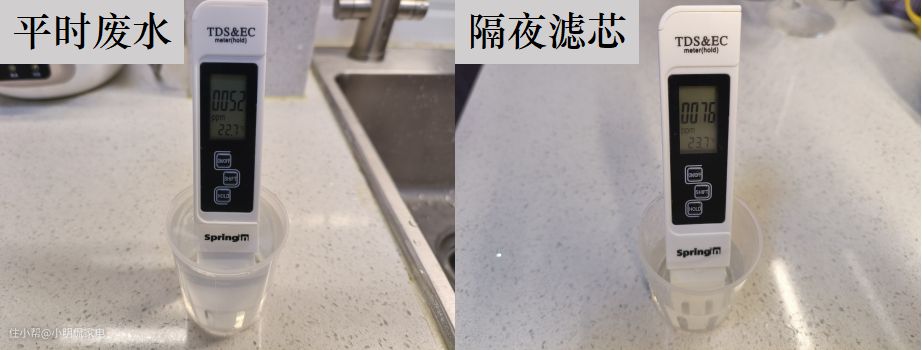 以及放了一晚上之后,滤芯里面废水的TDS值,还是有明显区别的。