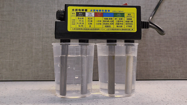 使用水质电解器进行电机,可以看到净化后的水(左侧量杯)几乎没有变化,而自来水变成了黄色。