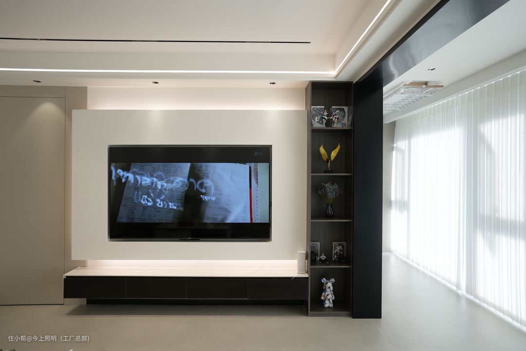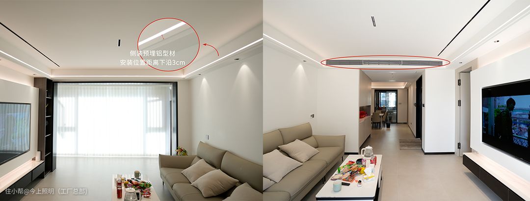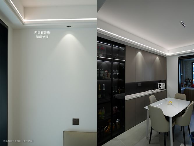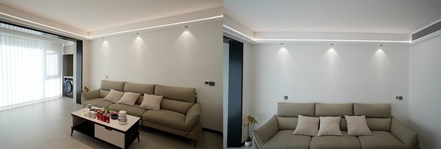 双眼皮吊顶和线形灯堪称绝配,在各大平台家装博主分享的案例中,十户有九户的双眼皮吊顶都搭配了线形灯。最简单常见的布局方式,就是在双眼皮吊顶下沿3cm处开槽,安装预埋铝型材,一条发光的直线环绕空间,灯光均匀,显得空间更加开阔通透。若线形灯安装在客厅等需要加装中央空调的区域,则要注意预留出空调出风口的位置。
