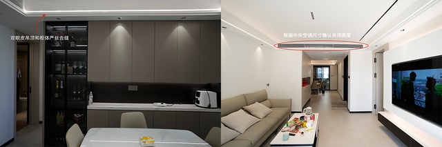 如客厅空间,双眼皮吊顶的尺寸要根据是否安装空调来确定,双眼皮吊顶的高度控制在30cm内,能更好地隐藏空调出风口、灯具或其他设备。
