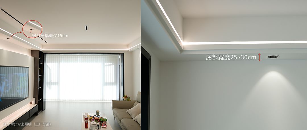 在双眼皮吊顶中安装射灯,可以为空间提供洗墙或补充照明,需要做宽边双眼皮吊顶,底部宽度建议约为25~30cm,高度不超过30cm,最终尺寸要根据户型面积大小确定。选择75开孔的黑光防眩射灯,安装位置离墙最少为15cm,光斑顶部不会过曝,可以在墙面投射出较为均匀柔和的小山丘光斑。