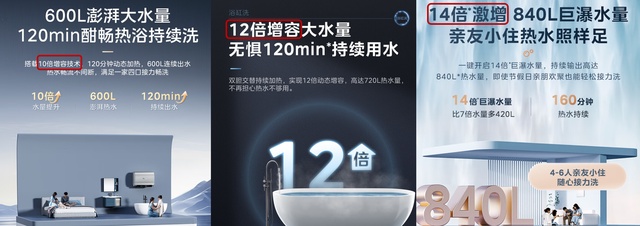举一个例子,比如60L电热水器10倍增容,可以实现连续出水600L。