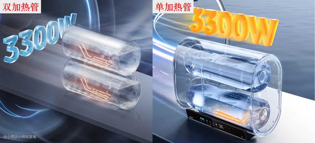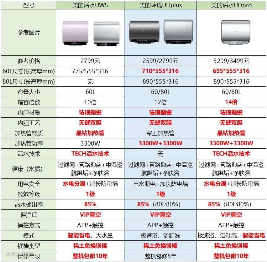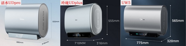 不过美的玲珑UDplus和美的活水UDpro是双3300W的加热管,美的活水UW5只有一个加热管。