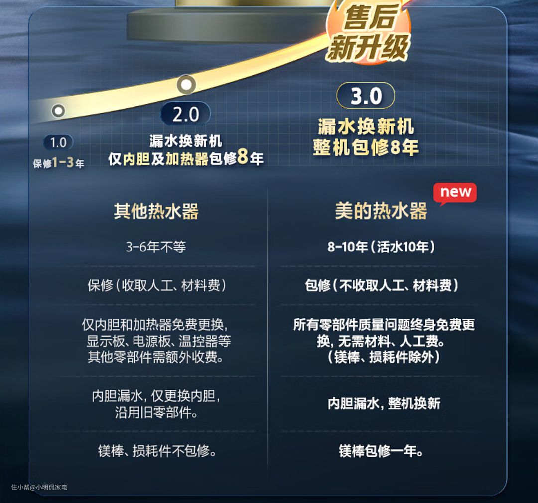 对于电热水器来说,一般品牌会提供3~6年主要部件包换,美的可以提供10年整机包修。