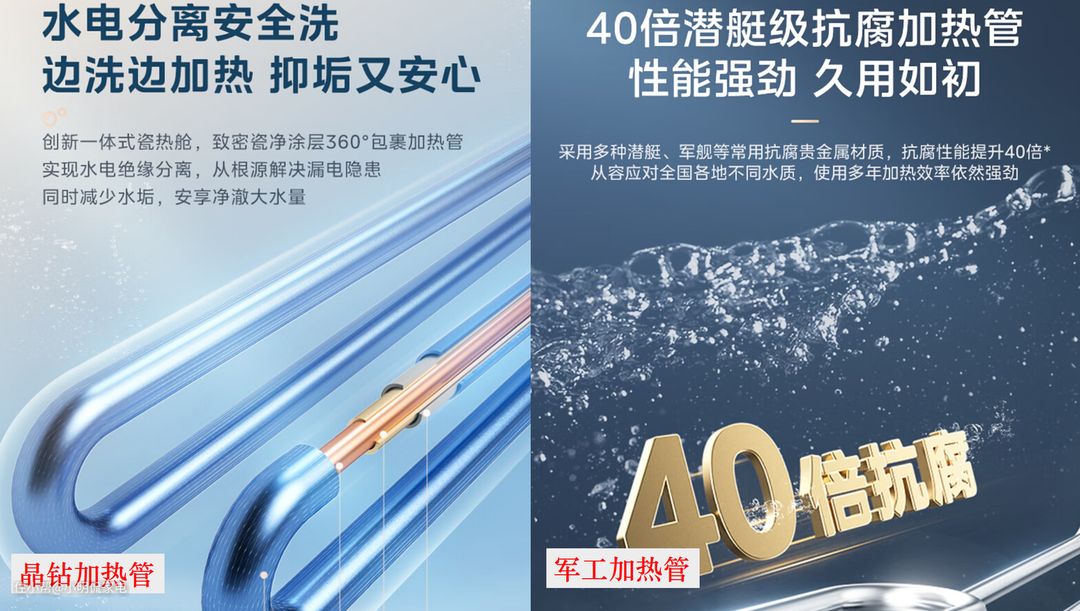 美的活水UW5和美的活水UDpro使用了晶钻加热管,也就是瓷热舱技术,可以做到水电分离。