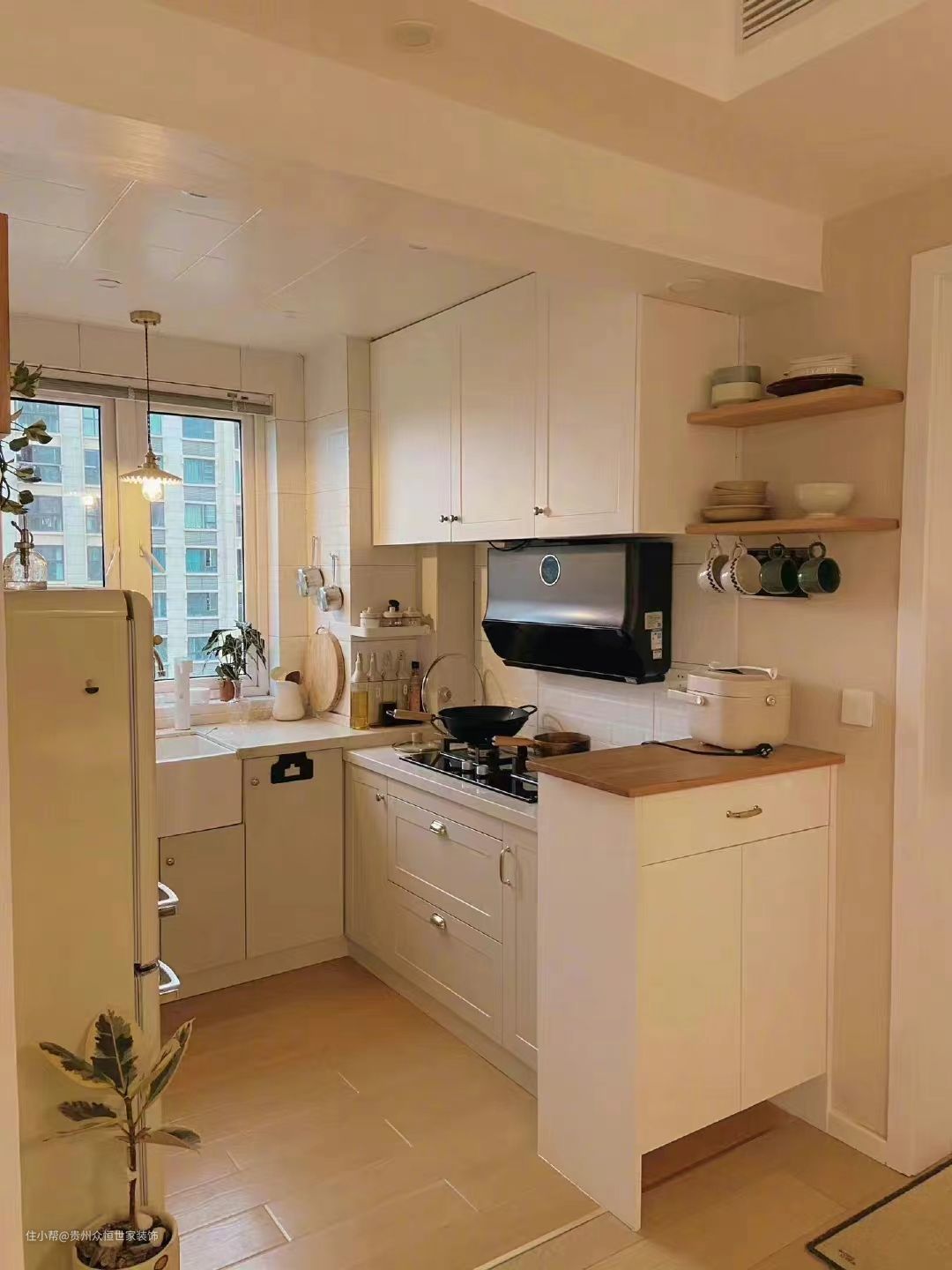 厨房贴木纹砖,看着与空间相得益彰。厨房U型设计,节省空间同时又更加美观,一旁搭建类似置物架壁龛,方便放一些碗和杯子,美观又清新。绿植以及窗户更显松弛感,厨房虽小但是五脏俱全。