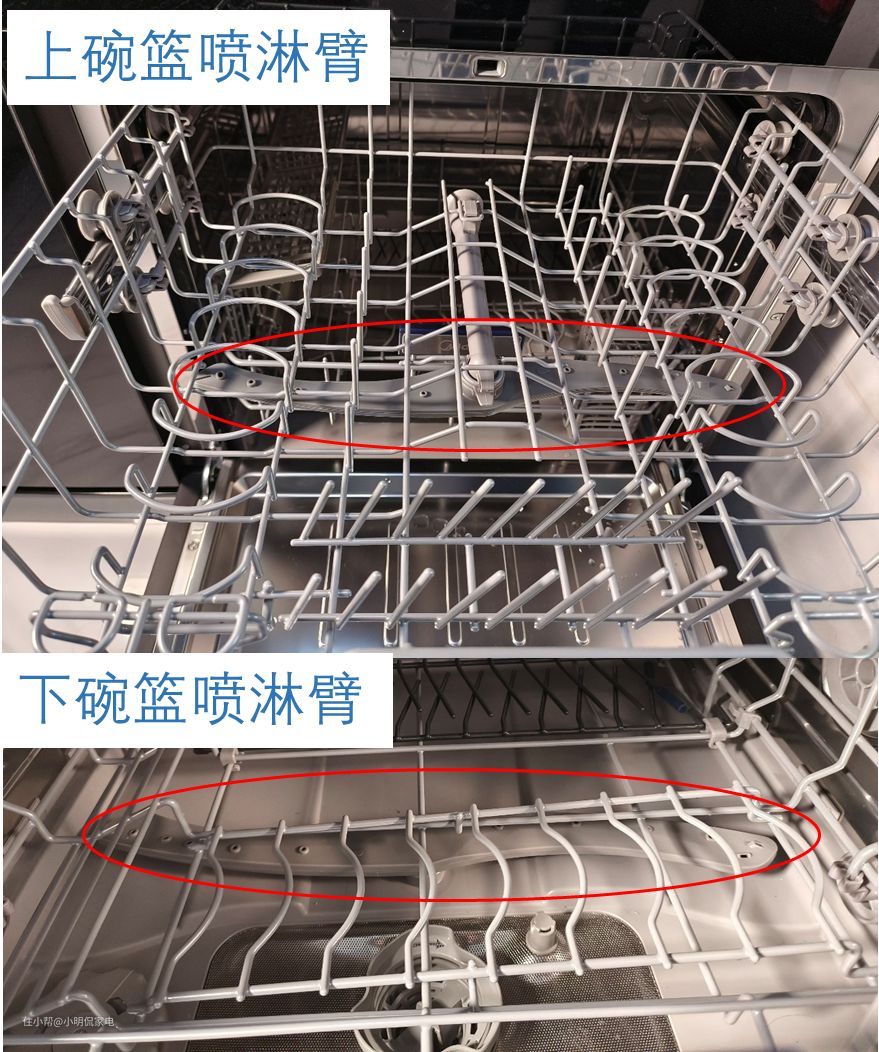 每层喷淋臂长度都足够,喷淋臂上面的喷孔也设计成了多方向,碗篮上面的各个角落都能照顾到。