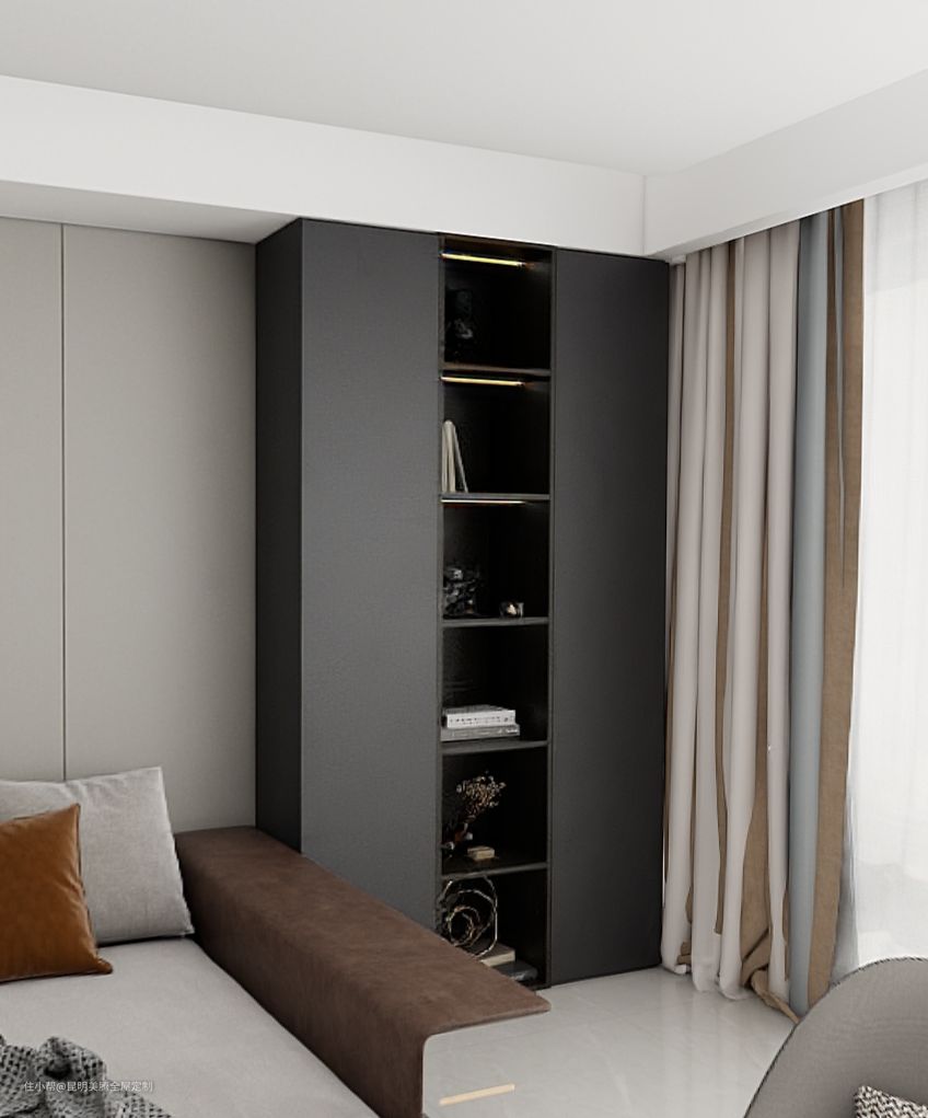 3.入户柜:入户柜以黑色为主色调,通体无拉手的设计,简洁又时尚。铝框玻璃门内放置着您心爱的包包,展示着您的品味与风格。挂衣区和换鞋凳的贴心设置,让您在进出门时都能感受到便捷与舒适。