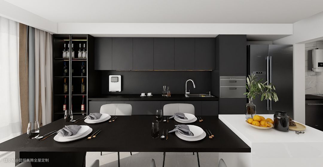 2.厨房:同样的黑色系,U 型布局的厨房展现出强大的收纳与操作功能。流畅的线条,精致的材质,让烹饪不再是繁琐的家务,而是一场愉悦的艺术创作。在这黑色的空间里,您可以尽情发挥厨艺,为家人烹制美味佳肴。