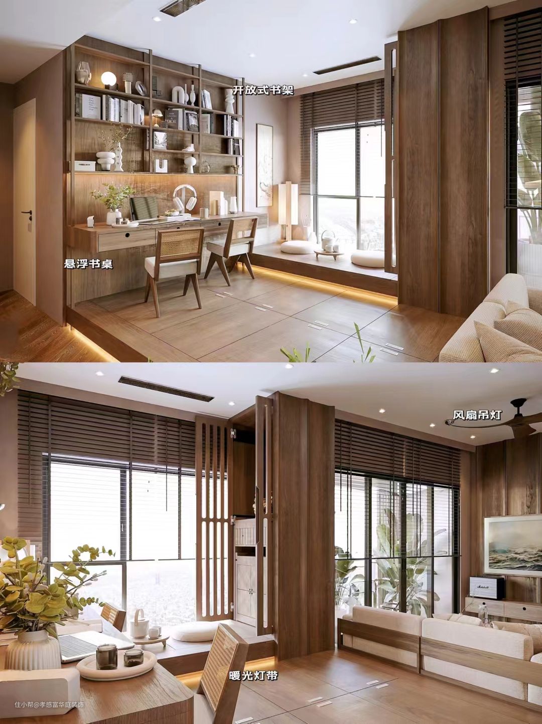 💫书房布局:在地台一角设置定制书桌,墙面安装悬浮式书架,既节省空间又显得轻盈时尚。书桌旁可放置一盏护眼台灯,为深夜阅读提供充足光线。📚💡