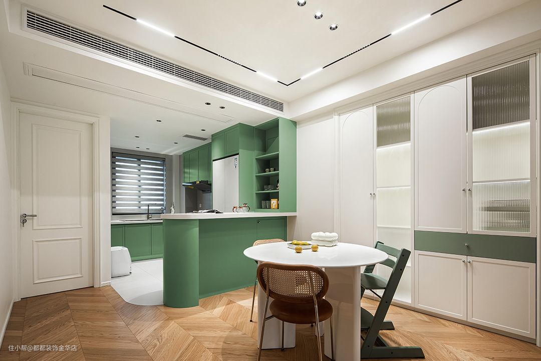 首先,选择开放式厨房可以让空间看起来更加开阔。与客厅或餐厅相连,增加视觉上的通透感。采用壁挂式橱柜和悬空式置物架,减少地面的占用,同时增加收纳空间。