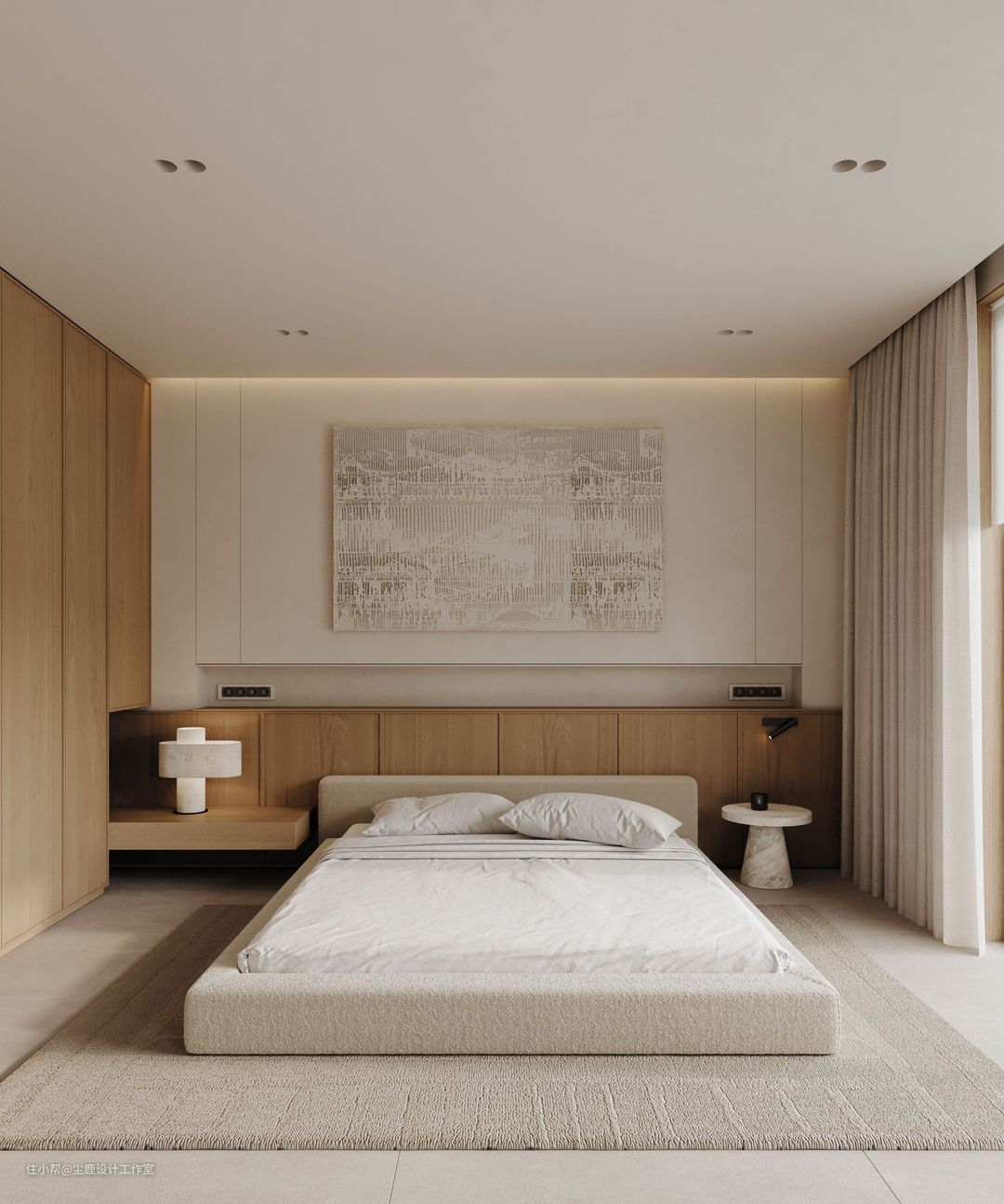 在设计卧室时,打破传统对称的床头柜布局,采用不对称的设计,床的一边从衣柜重延申出悬空床头柜,一边用装饰边几做床头柜,可以为卧室带来新颖的视觉效果和空间感。以下是一些建议,帮助您实现这一设计: