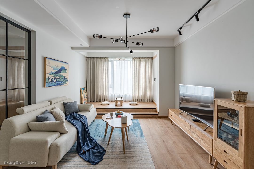 虽说设计中设计师还是用了白色和原木色作为全屋的主色调,但在墙上的挂画选择【富岳三十六景】,又以抱枕、地毯等相互搭配,作色调上的呼应,给单调的空间增添了一丝生气与活力。